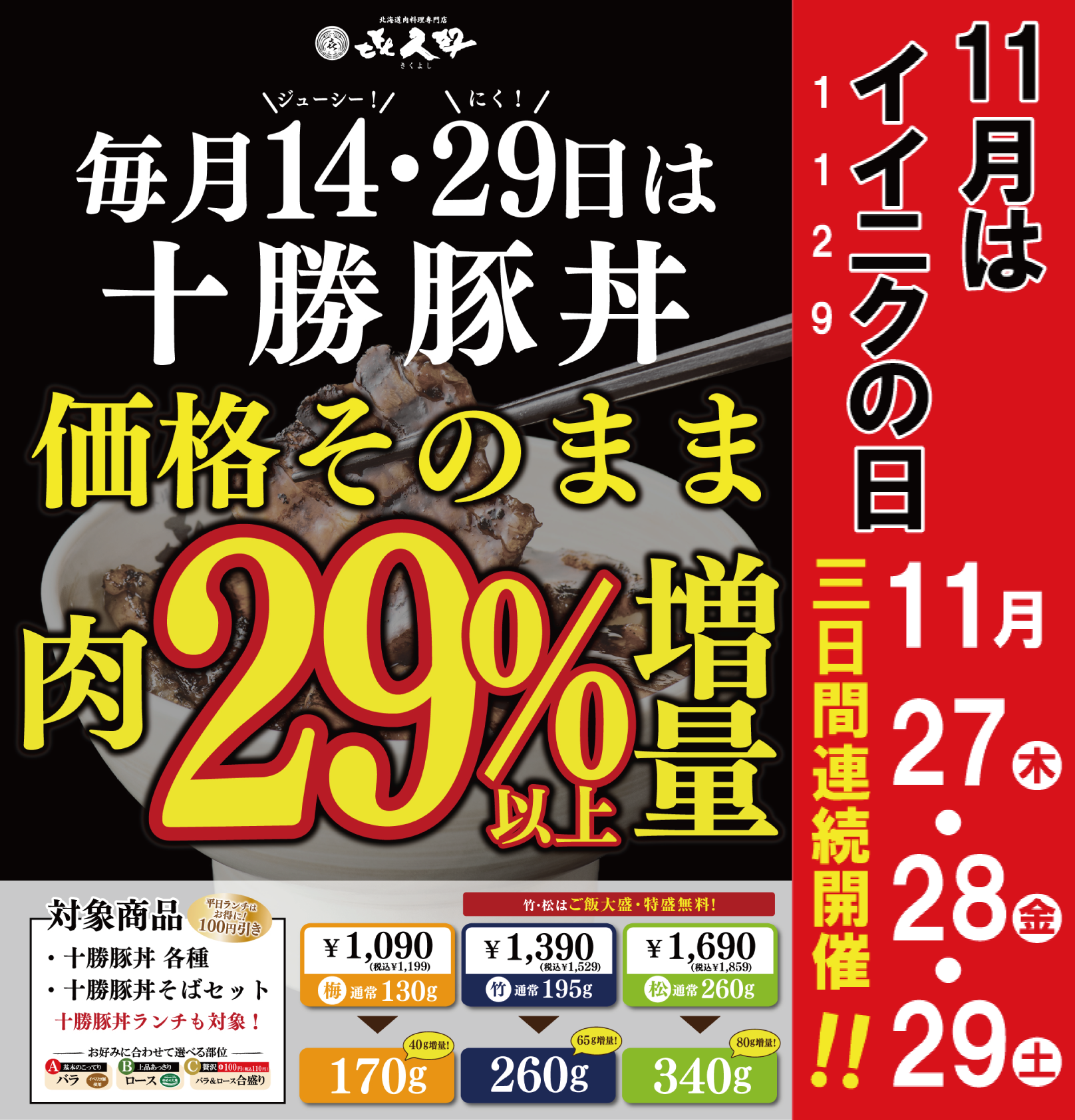 ジューシーの日(14日)・肉の日(29日) にちなんで、十勝豚丼の肉が29%以上増量!